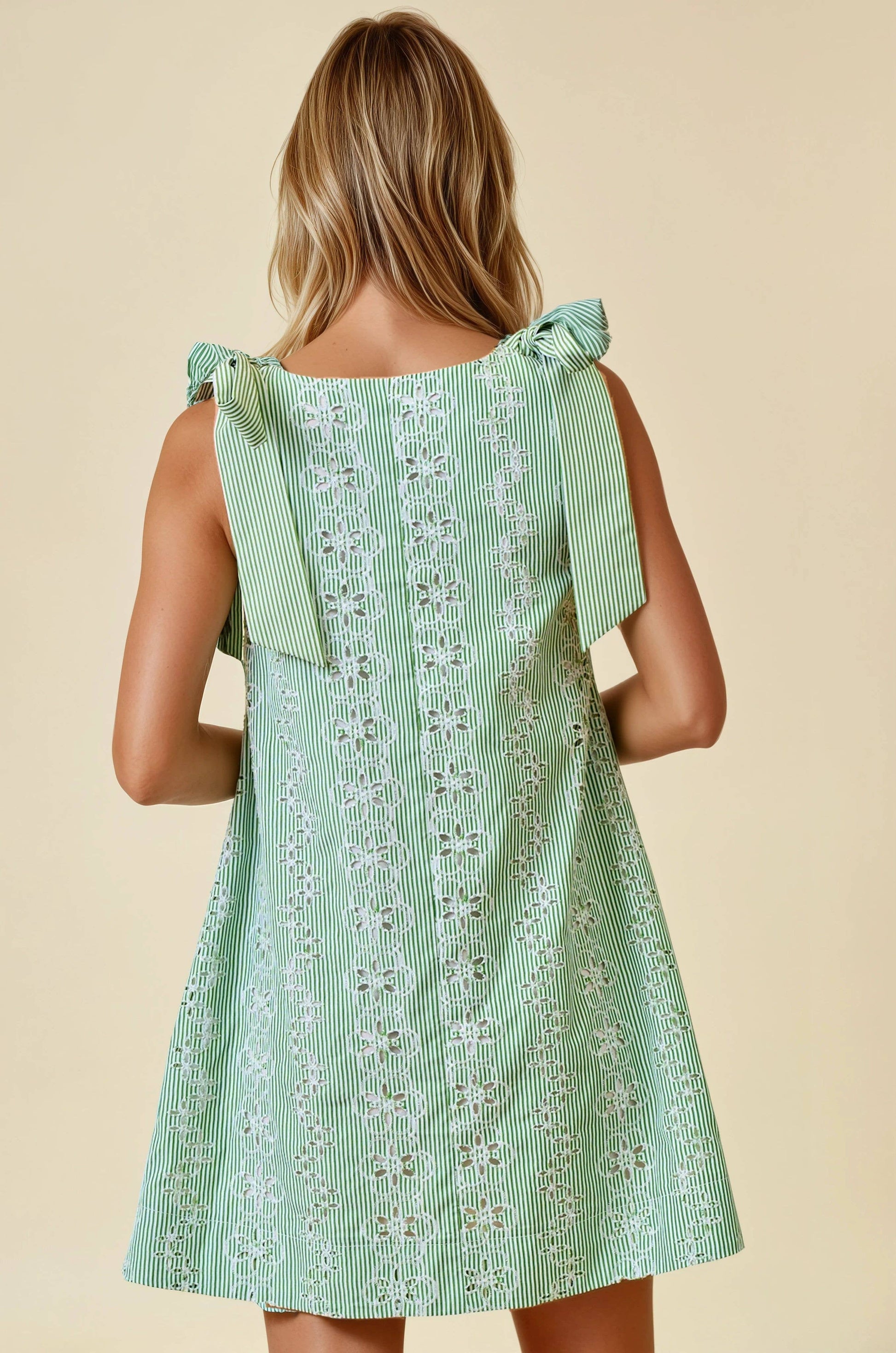 STRIPED & EMBROIDERED EYELET TIE SHOULDER MINI DRESS W/ LINED
