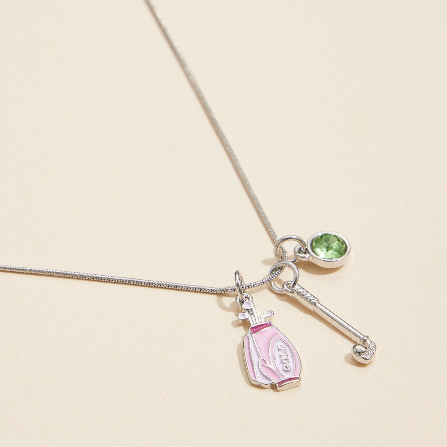 This playful necklace celebrates a love for golf with three unique charms. Featuring a miniature pink golf bag, a detailed club charm, and a sparkling green gemstone that brings a touch of elegance, this piece is perfect for golf lovers who want to carry a bit of the course with them. The slender chain complements the charms, making it ideal for daily wear or as a thoughtful gift for anyone with a passion for the game.